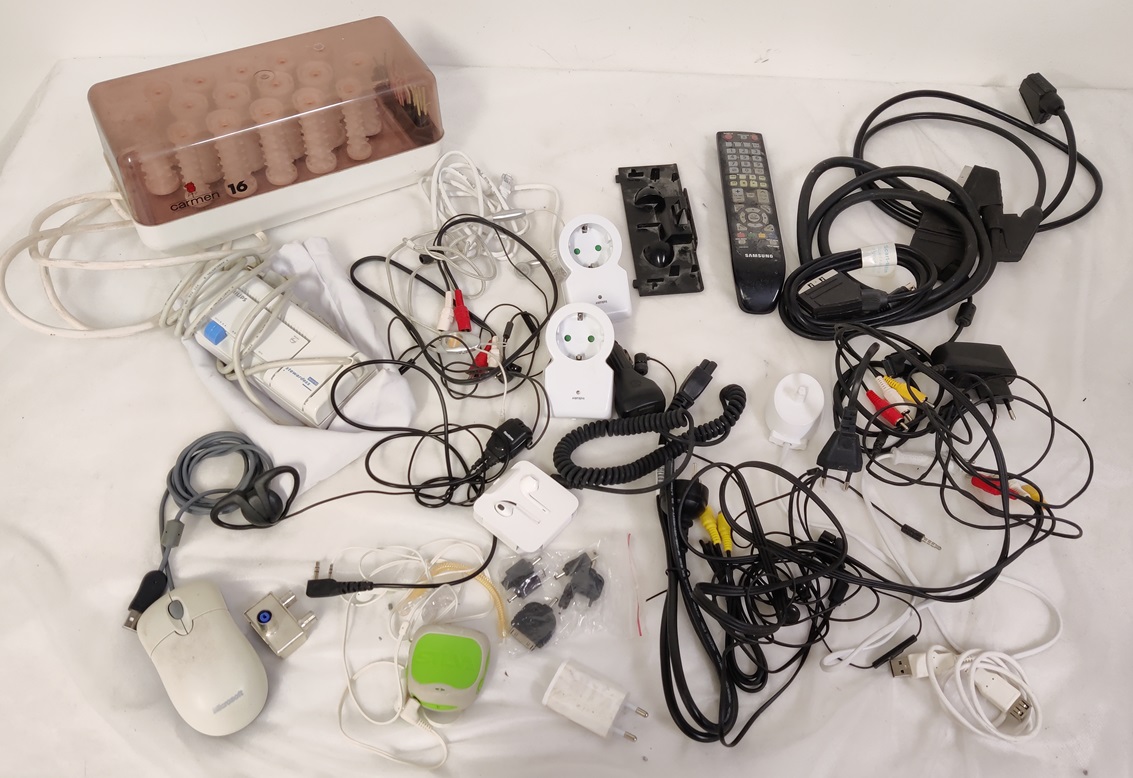 Kassillinen sekalaista elektroniikkaa, johtoja, liittimiä, kuulokkeita yms