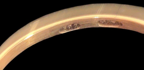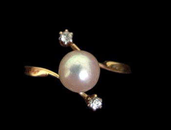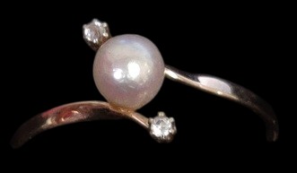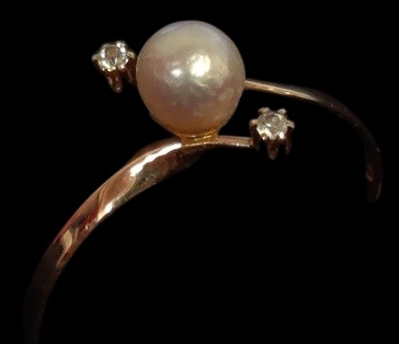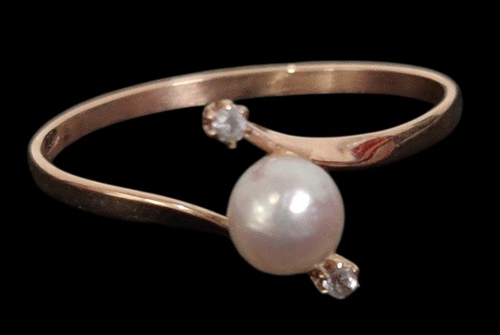 Kultainen 585 sormus, nimileima A/K, ohut ja siro, pieni helmi ja kaksi zirkonia, kaivertamaton, koko 18,25, kokonaispaino noin 0,95 gr