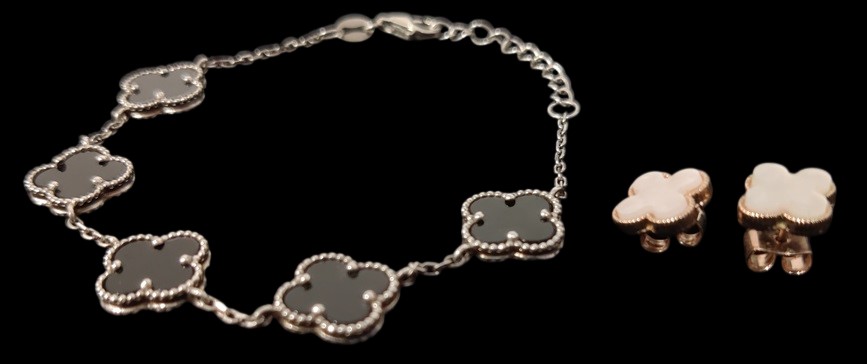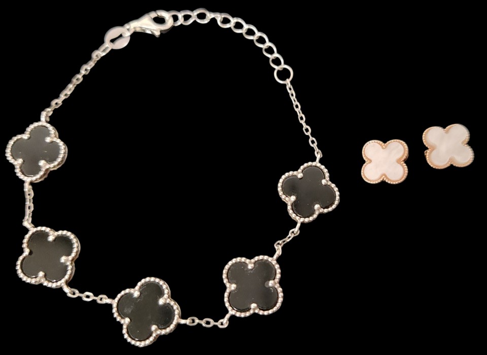 Hopeinen 925 neliapila rannekoru pituus sädettävä 15-18 cm, kullanväriset neliapilakorvakorut, tappimalli