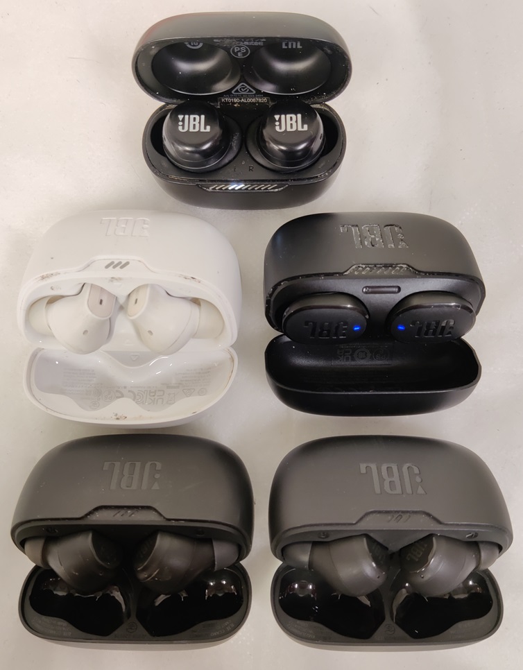 5 kpl JBL nappikuulokkeita, mm. JBL Beam, Live ja T130 NC, kaikki testattuja ja toimivia