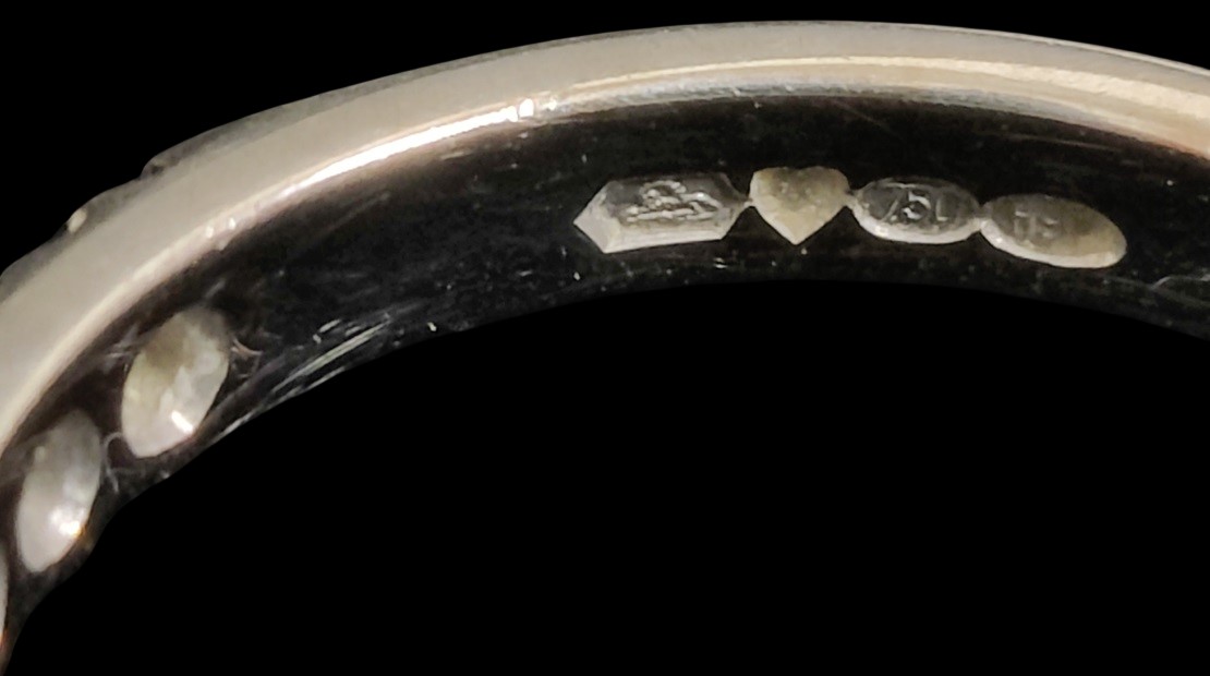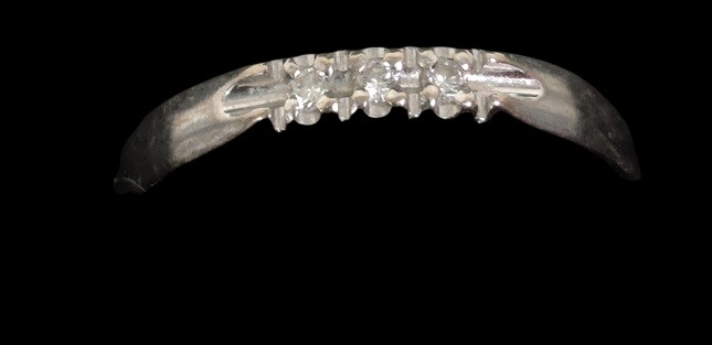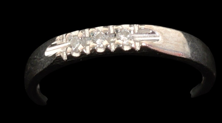 Valkokultainen sormus, kulta 750, 3 pientä timanttia halkaisijaltaan n. 1,4 mm, sormuksen koko noin 17,25, paino n. 3,68 gr, kaiverrettu