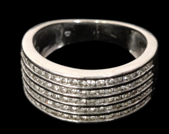Valkokultainen 5-rivinen timanttisormus, pieniä timantteja 100 kpl, joka rivissä 20, 585, KJ, kaivertamaton, koko n. 15,25, kokonaispaino n. 4,3 gr