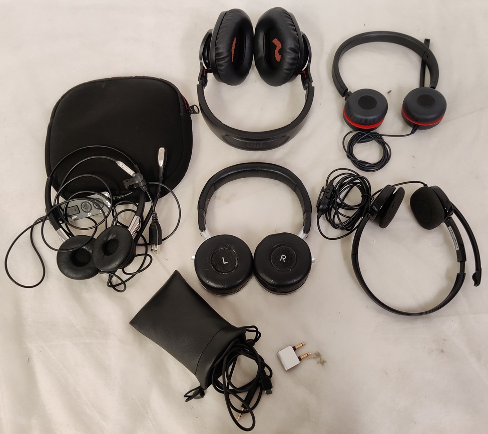 5kpl erilaisia sankakuulokkeita, langattomia ja johdollisia mm. JBL, Jabra ja Logi, osassa käyttökulumaa, mukana sekalaista lisävarustetta. JBL sankakuulokkeet siistikuntoiset, mutta ei toimi, sopii esim. varaosiksi, muut testattuja ja toimivia