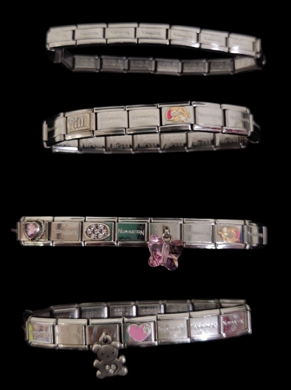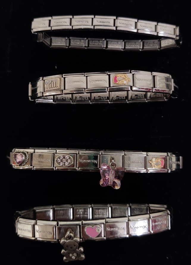 4 kpl Nomination rannekoruja, erikoispaloja yhteensä 14 kpl, 1 korussa ei ollenkaan erikoispaloja, kahdessa muutamia ja yhdessä paljon