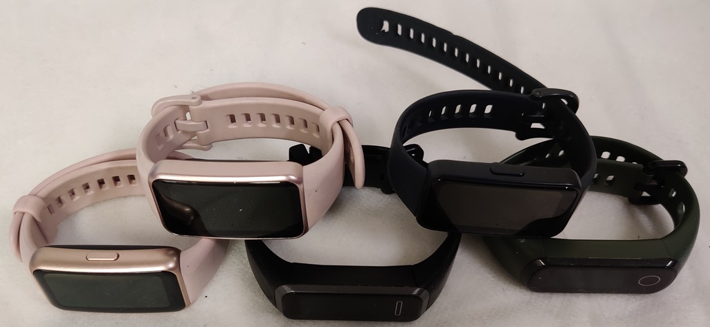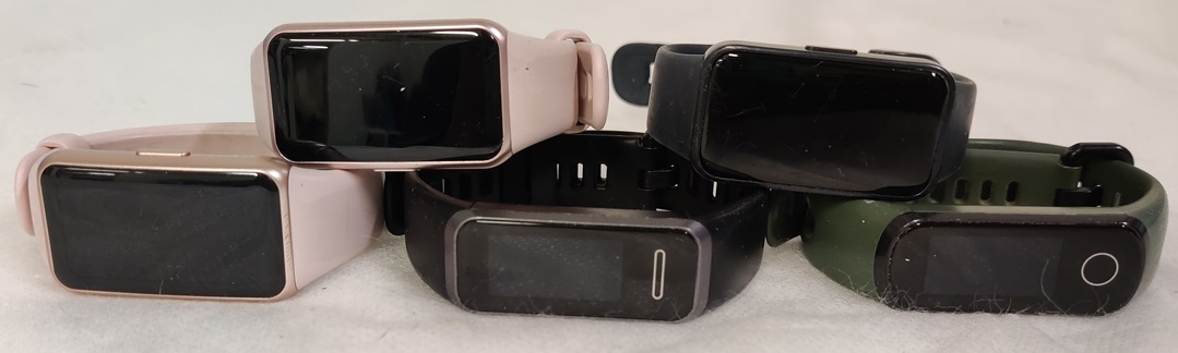 5 kpl Huawei Band aktiivisuusrannekkeita, Band 4, Band 5i (ei suomenkielinen), Band 6, Band 7 ja Band 8, kaikki testattuja ja toimivia, yhdestä puuttuu remmilenkki