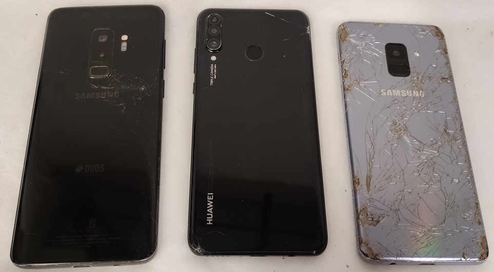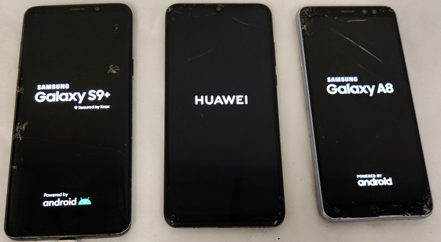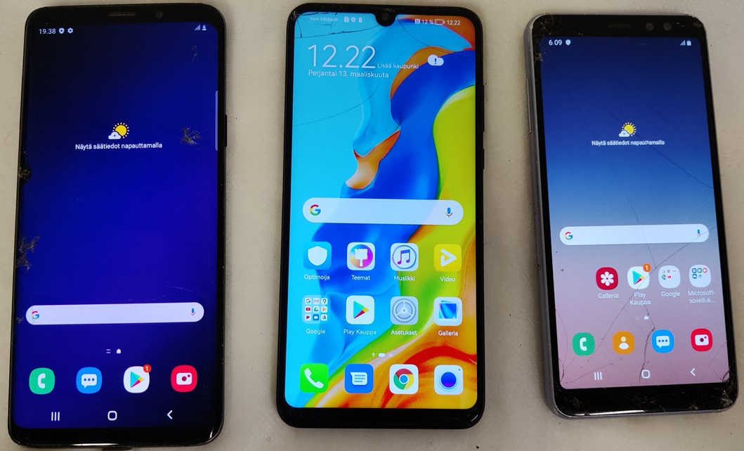 3 kpl puhelimia, 2 Samsung ja 1 Huawei: Samsung Galaxy A8 (2018), SM-A530F, 32GB. Näytössä isoja naarmuja ja lohkeamia. Takalasi on erittäin pahasti lohjennut useasta kohdasta. Samsung Galaxy S9+, SM-G965F, 64GB. Näytössä on paljon halkeamia, säröjä ja naarmuja. Myös pieni näyttövika oikeassa reunassa keskellä. Takalasissa säröjä ja käyttökulumaa, Huawei P30 Lite, MAR-LX1A, 128GB. Näytössä on isoja halkeamia ja naarmuja. Takakuoressa on pieni lohkeama ja naarmuja. Kaikki puhelimet testattuja ja toimivia