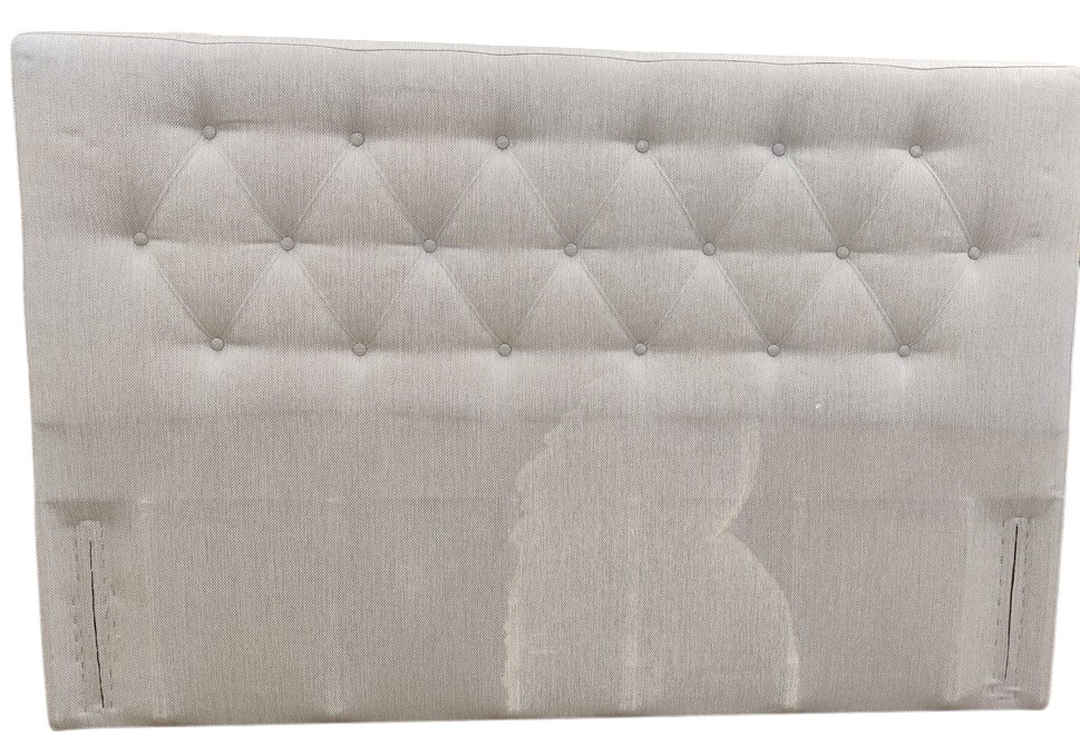 Kangaspintainen irtonainen sängyn pääty nappikoristein, iso tahra, joka pääosin jää tarvittaessa sängyn rungon taakse piiloon tai voi kokeilla pestä tekstiilipesulla, muutoin ehjä ja takaa siisti, L: 160, K: 105, S: 10, VAIN NOUTO
