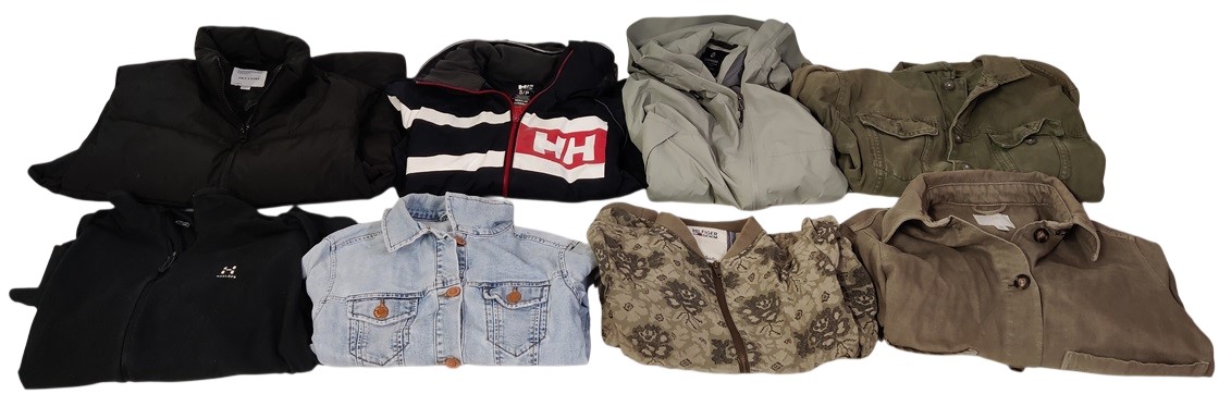 24 kpl erilaisia ei niin talvisia takkeja, keväästä syksyyn sopivia, monenlaisia ja eri kokoisia, mm. Helly Hansen, Tommy Jeans, Didrickson, Haglöfs, Amisu, Soya Consept, Produkt, Seppälä, Future Sport, Lyle & Scott, Jack & Jones, Bugatti, myös yksi toppaliivi mukana