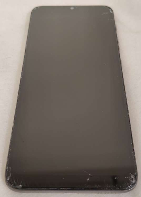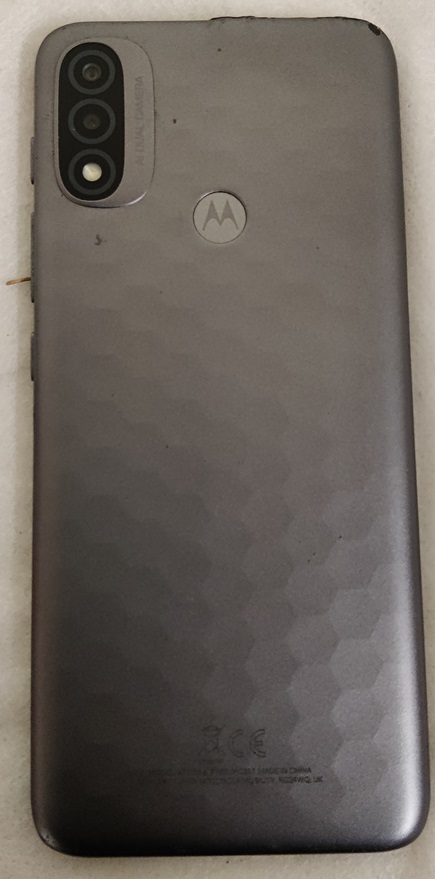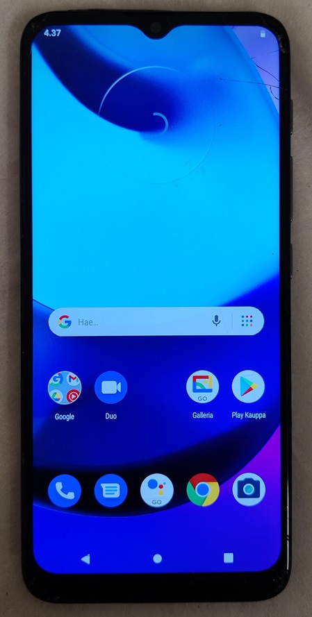 Motorola Moto e20, XT2155-6, 32 Gt, etulasissa säröä ja halkeamia, pieniä palasia puuttuu kulmista, takakansi siisti, testattu ja toimiva