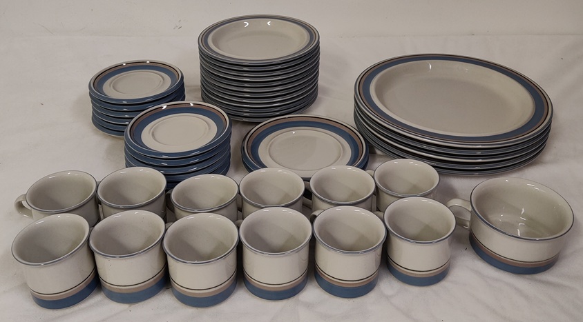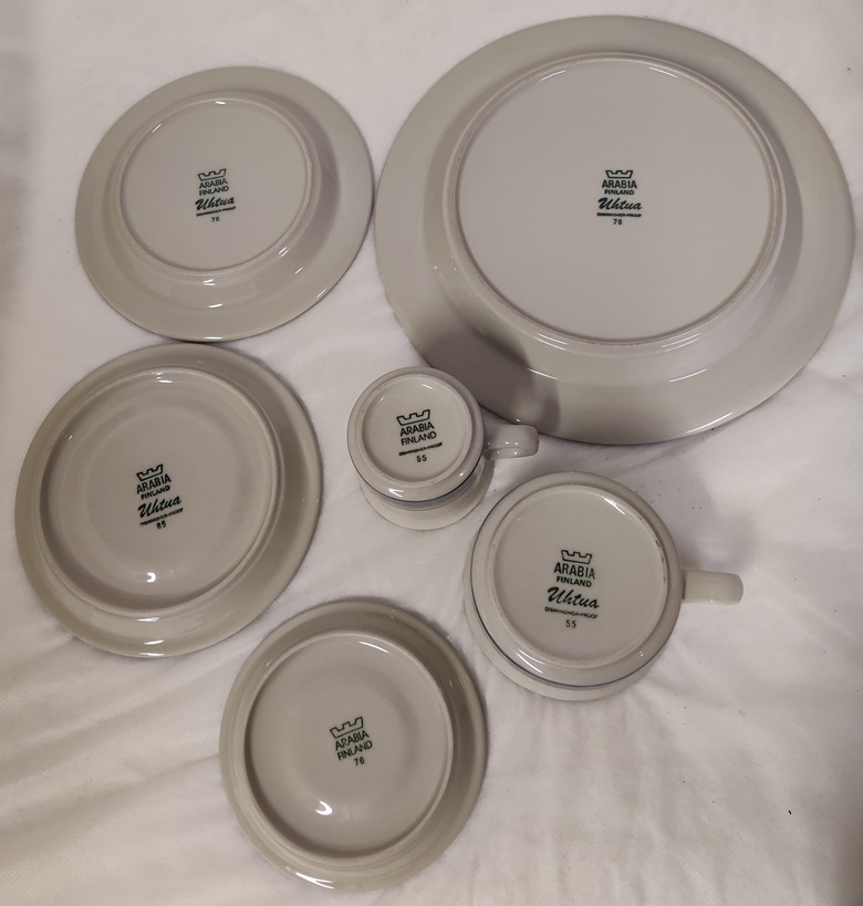 Arabia Uhtua astiasto: 12kpl kahvikuppeja, tasseja ja leipälautasia, 5kpl ruokalautanen, 1kpl teekuppi sekä 2 kpl tasseja, ehjiä ja siistejä