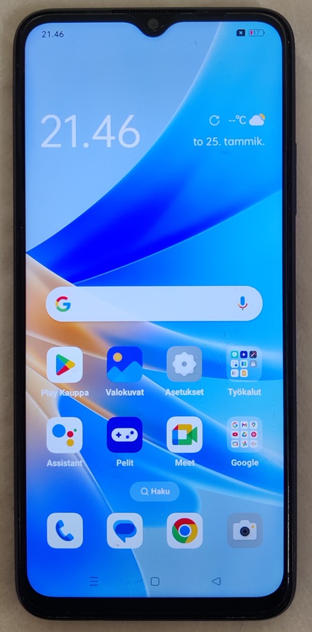 Oppo A17, CPH2477, 64 Gt, etulasissa suojakalvo, takakansi siisti, pieni kolhu alasivureunassa takanannen nahkassa, testattu ja toimiva