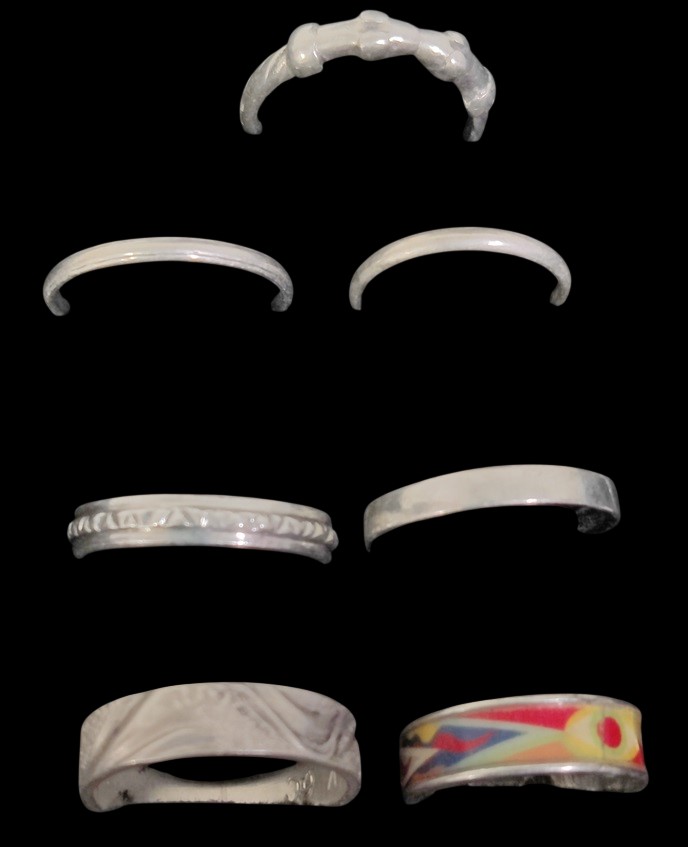 7 kpl hopeisia kivettömiä sormuksia, koot vaihtelee 16,5-18 välillä, osa kaiverrettuja, yhteispaino noin 12,65 gr