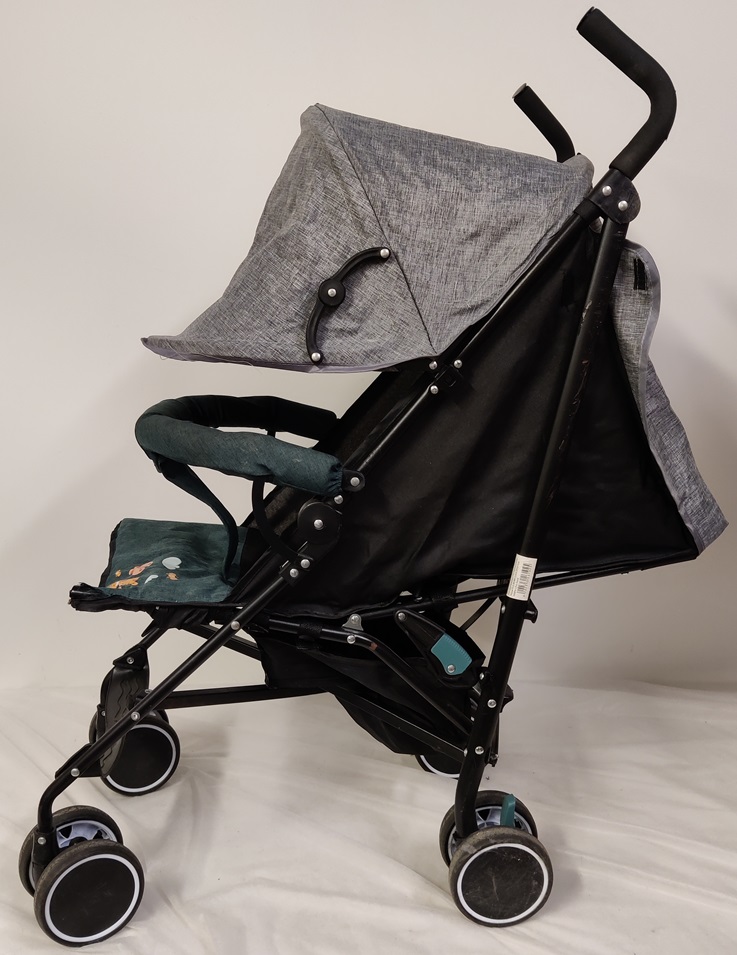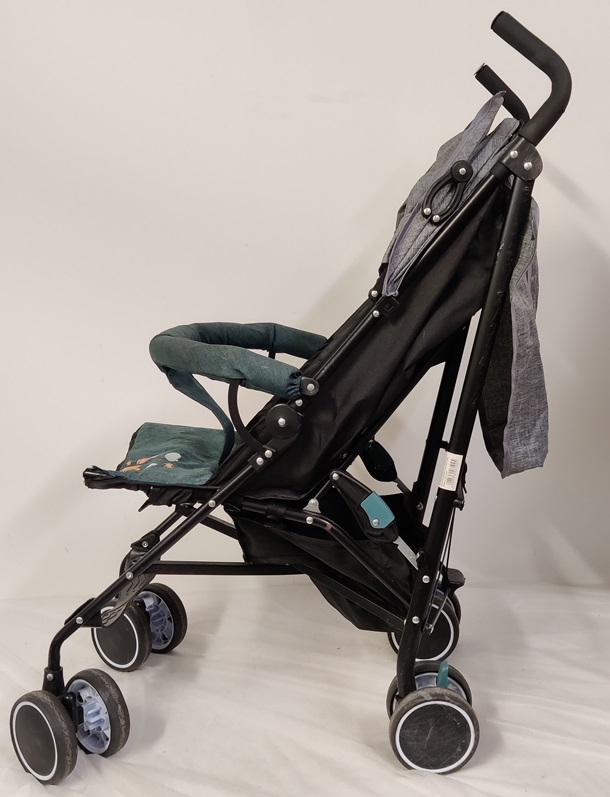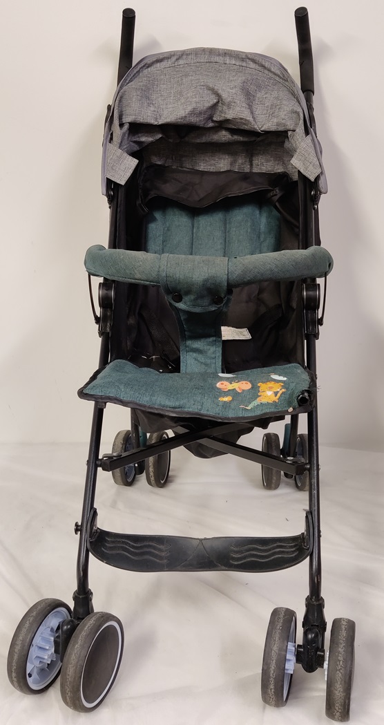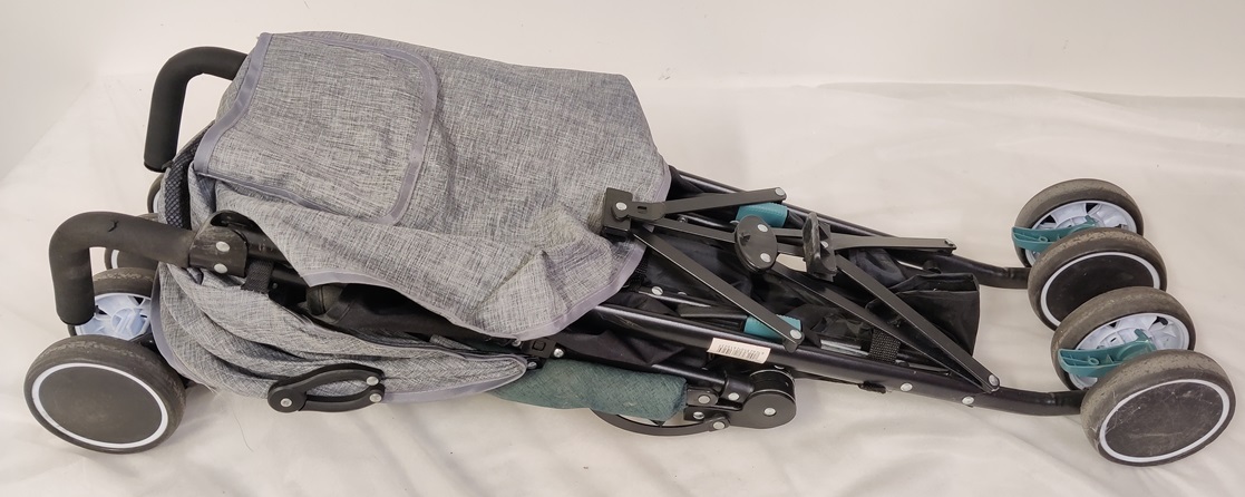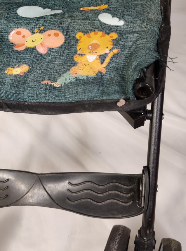 Matkarattaat, helposti kokoontaitettavat, istuimen selkänojan saa alas, kuomu peittää istuimen kokonaan alaslaskettuna, etuosassa pehmuste rispaantunut yhdestä kulmasta rikki, muutoin vain pientä pesua ja siisti peli