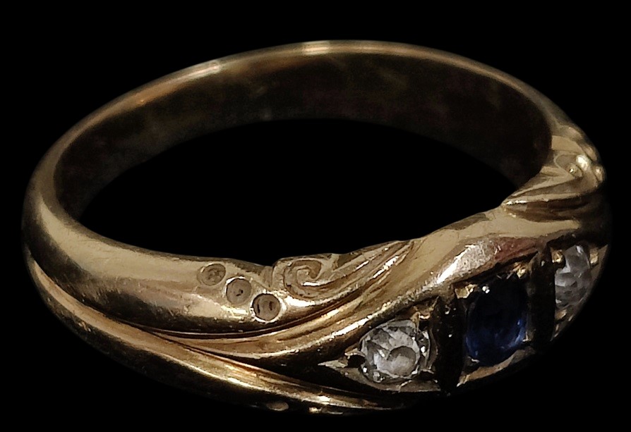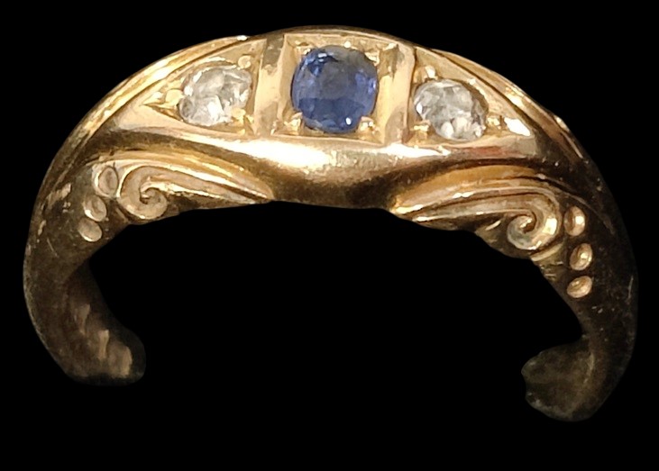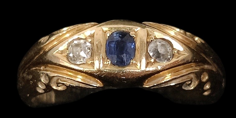 Kultainen sinisafiiri-timanttisormus, leimat HK&S (?), kruunu 18, ankkuri ja X, paino kokonaisuudessaan n. 5,65 gr, kaivertamaton