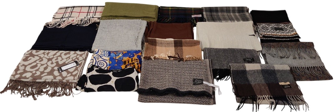 17 kpl erilaisia hyväkuntoisia huiveja, merkkeinä mm. Lapuan Kanpurit, UGG, R Collection, Vero Moda (uusi), Gudrun Sjöden, materiaaleina mm. silkkiä, villaa, merinovillaa, cashmereä