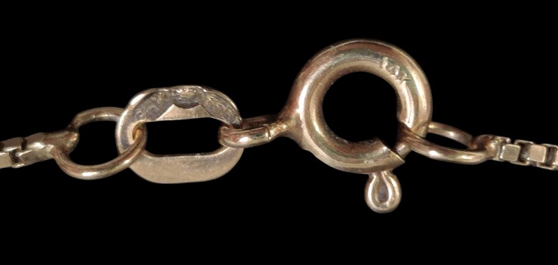 Kultainen 585 venetsia-ketju 43 cm, riipus korkeus ketjulenkkeineen n. 13,3 mm, leveys n. 9 mm, kaivertamaton, kokonaispaino noin 3,13 gr