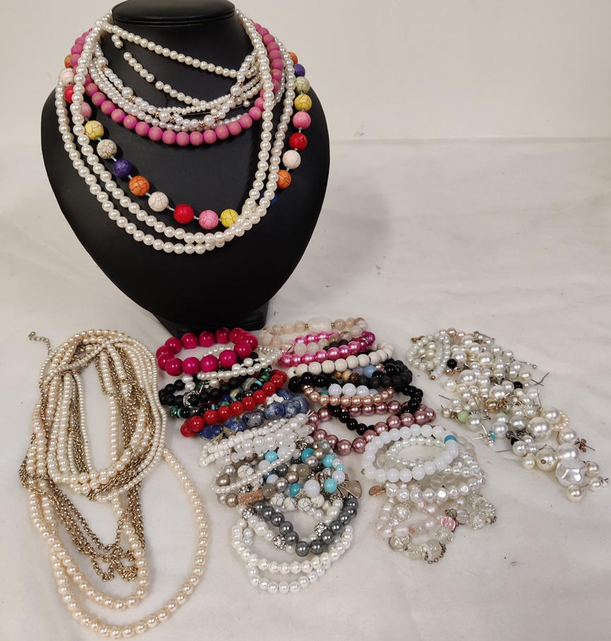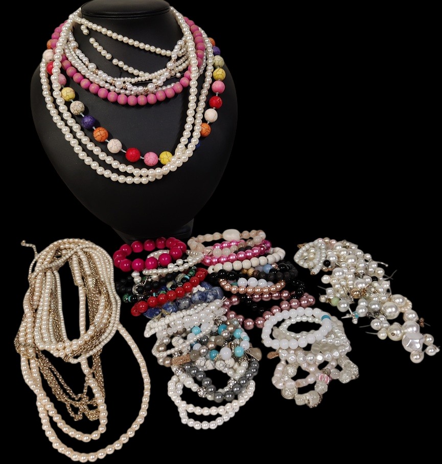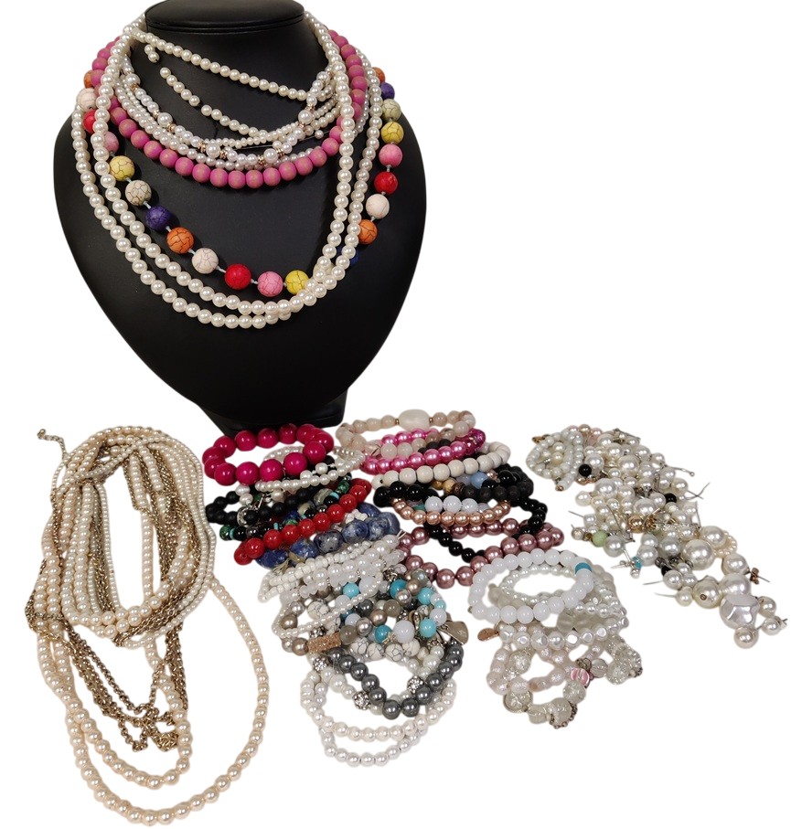Noin 800 gr sekalaisia helmikoruja; kaulakoruja, rannekoruja ja korvakoruja, materiaalina muovi, kivi, puu yms, mahdollisesti myös aitoja helmiä