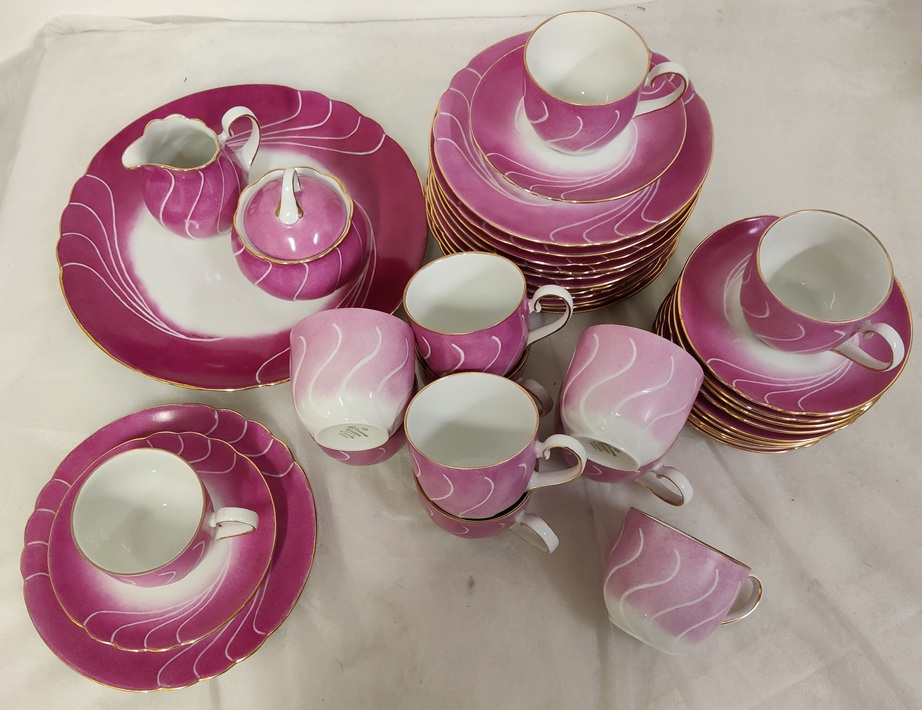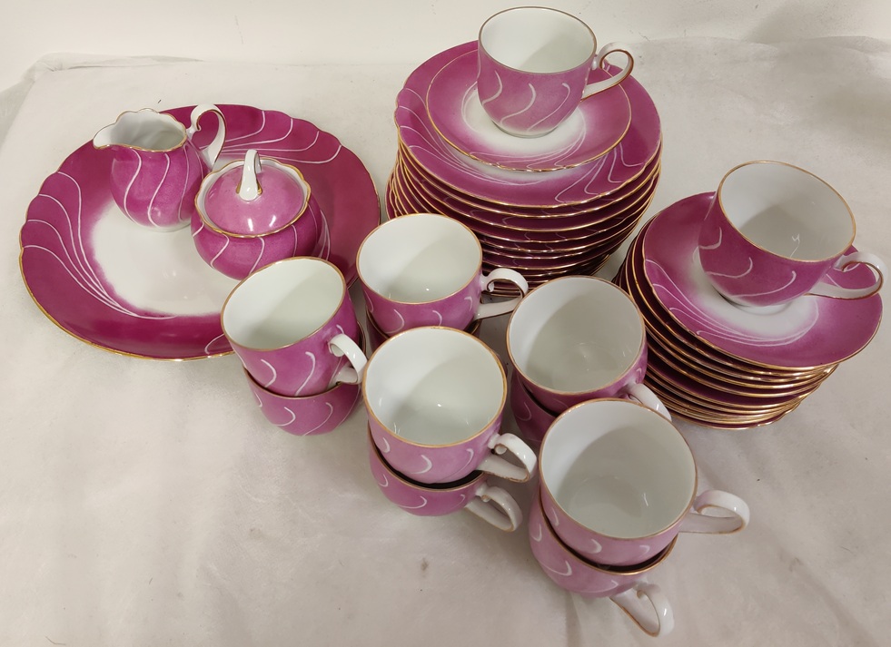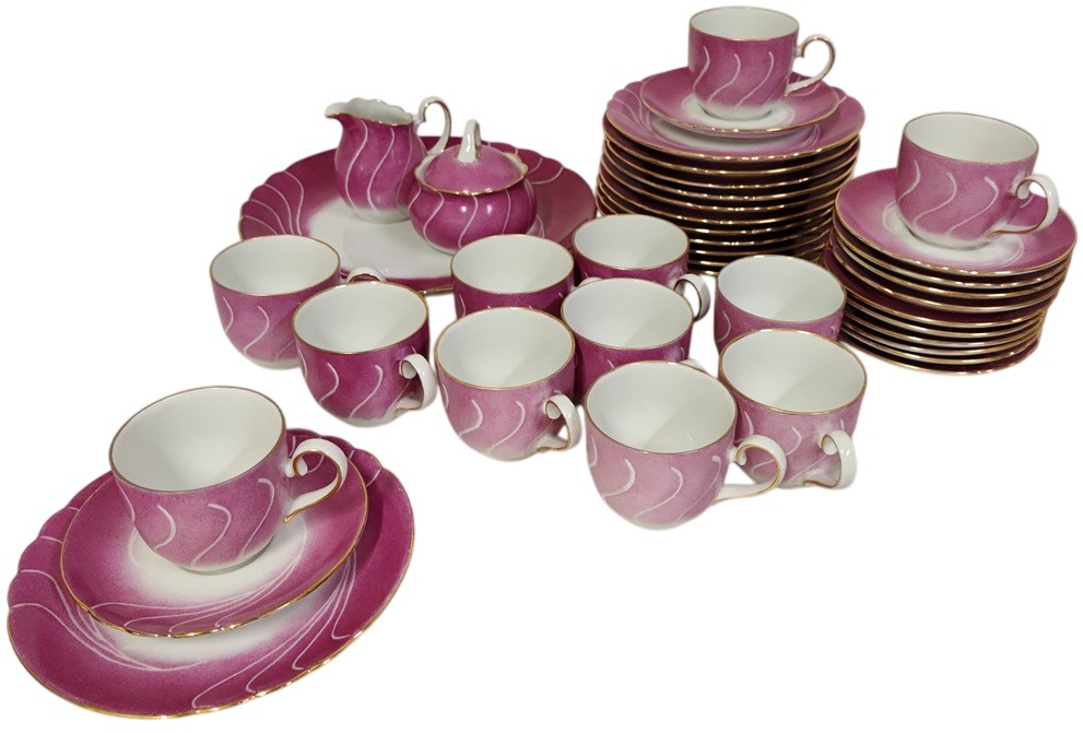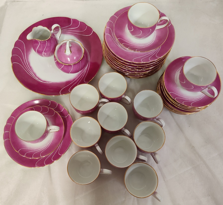 39 osaa; 12 kupin, tassin ja lautasen kahviastiasto, iso vatilautanen, kermakko ja sokerikko, saksalaista posliinia, käsin maalattu 1987, kunto erinomainen, käyttämätön kahviastiasto, ei naarmuja, ei kulumaa, poltettu, käsin maalatuissa kupeissa on hieman sävyeroja, kaunis ja hempeä kokonaisuus! Sopii hyvin vaikka kesäkahvilaan tai mökille tai miksei ihan arkikäyttöönkin!