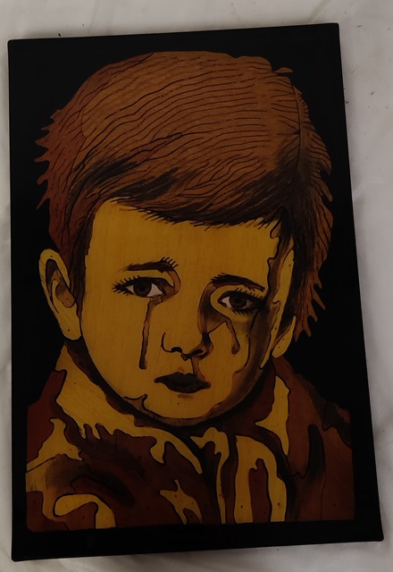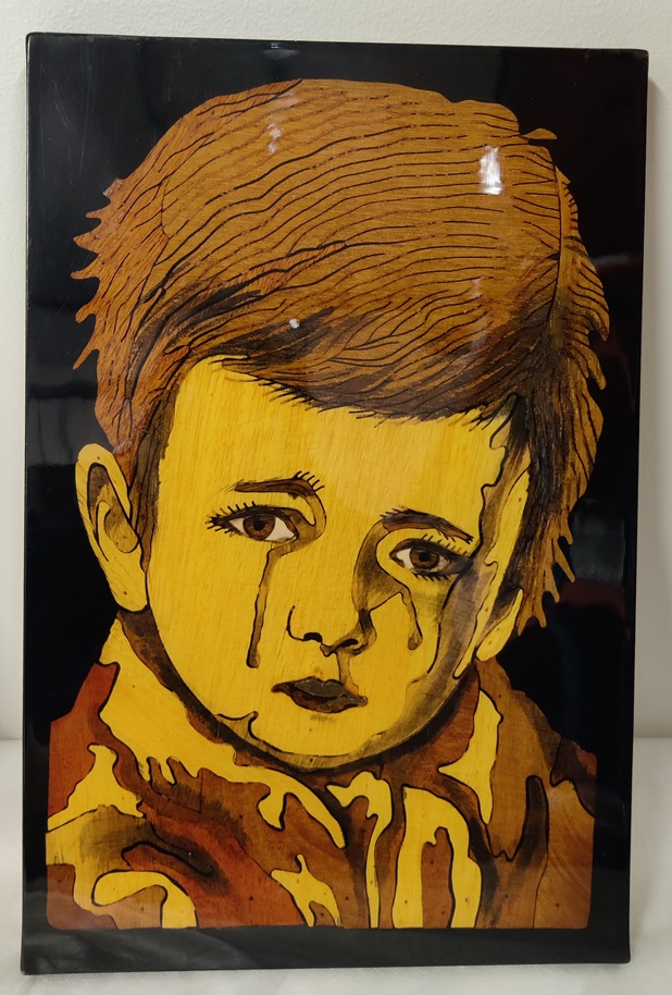 Polyesterilakkataulu. Taulun kuvio on ensin piirretty, jonka jälkeen suunnitelman vaatimat osat leikataan halutuista puulajeista ja liimataan taustavaneriin. Kuvioinnin päälle kaadetaan paksu kerros värjättyä polyesterilakkaa. Väri voi olla mustaa, punaista tai sinistä. Lakan kuivumisen jälkeen taulua hiotaan niin, että kuviointi ja puulajien värit tulevat näkyviin, tämän jälkeen taulu vielä lakataan värittömällä lakalla, hiotaan ja kiillotetaan. Lopputuloksena hienoa uniikkeja tauluja! Taulun koko n 24 cm leveys ja 36 korkeus.