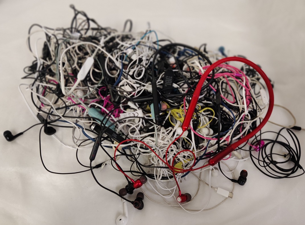 Pussillinen erilaisia johdollisia nappikuulokkeita, joitakin bt-kuulokkeita