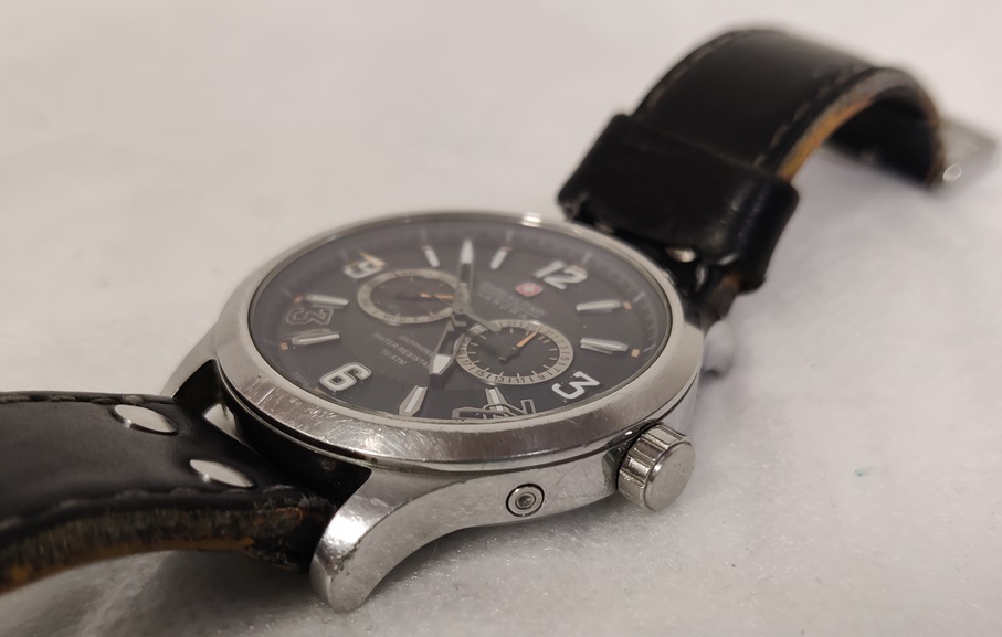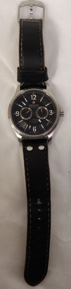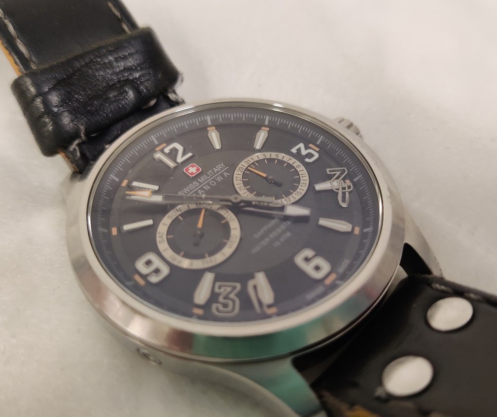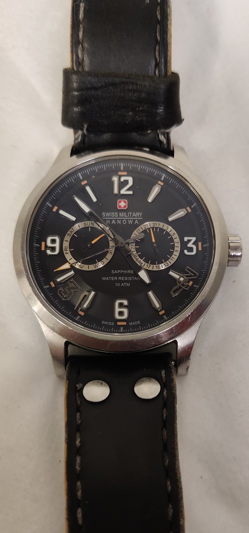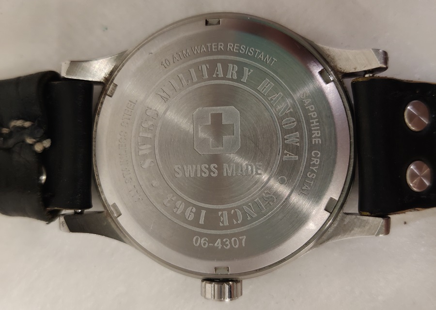 Swiss Military Hanowa 06-4307, mustalla kellotaululla, paristo vaihdettava, viisari hyppii, toimiva, kellolasi siisti ja naarmuton, ranneke kulunut