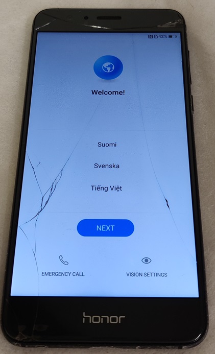 Honor 8, FRD-L09, 32 Gt, etu- ja takalaseissa paljon halkeamia ja säröä. Testattu ja toimiva