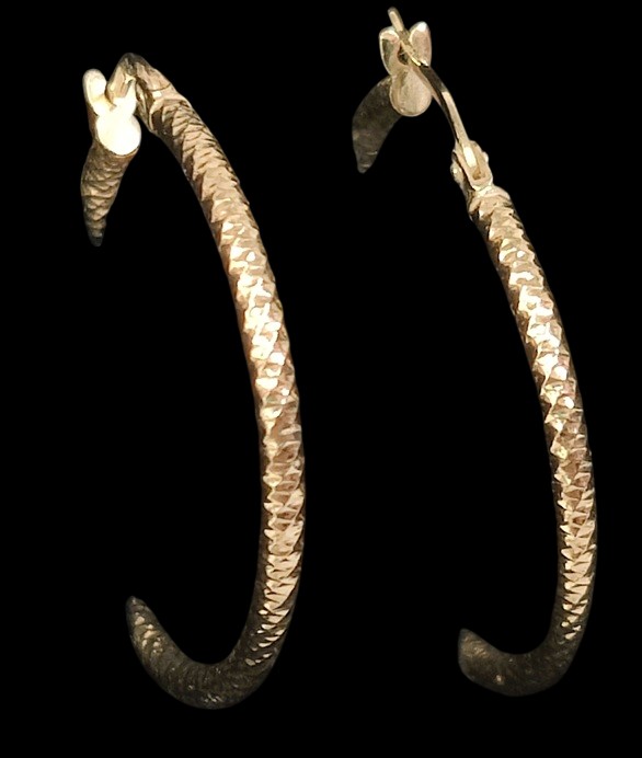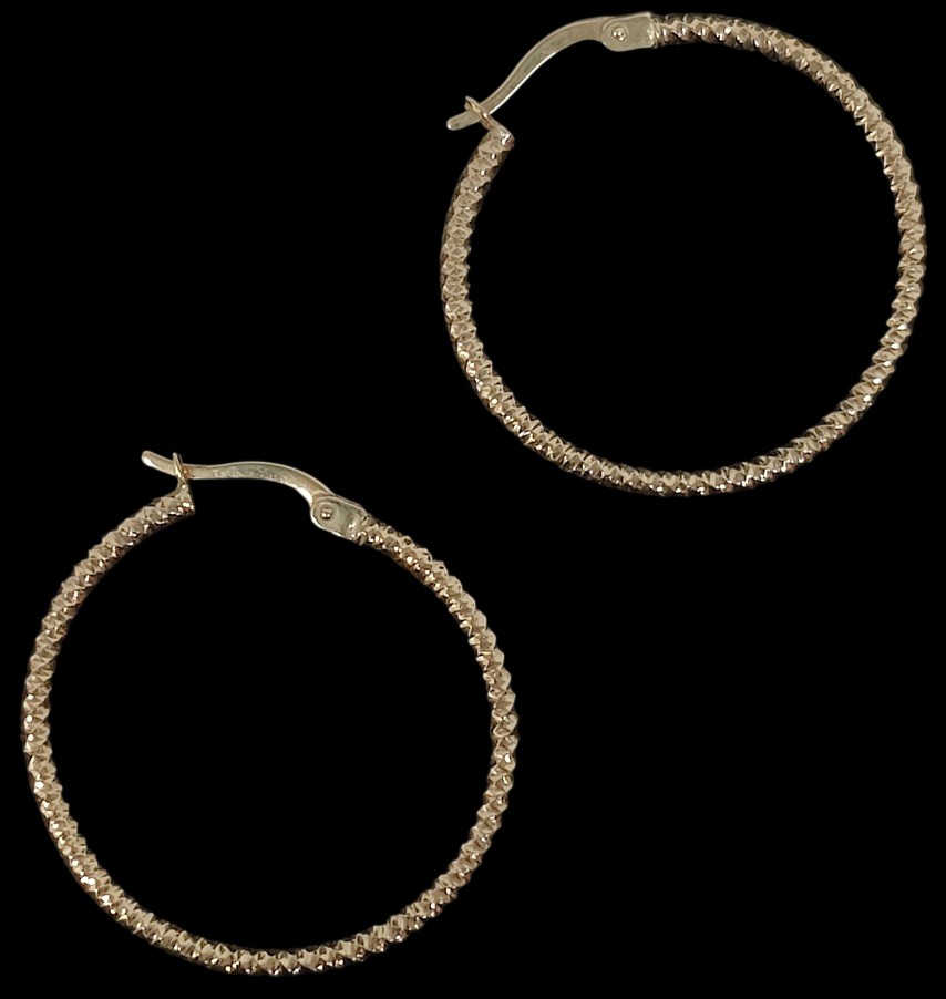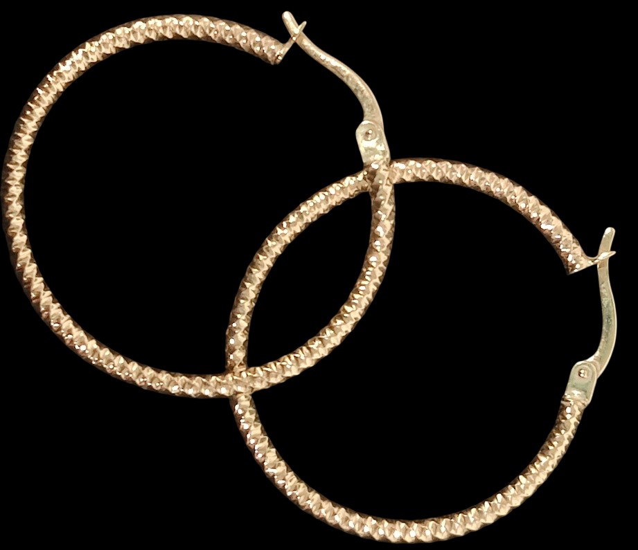 Kultaiset 585, ohuet korvarenkaat, kuviointi, halkaisija noin 3 cm, yhteispaino n. 1,37 gr