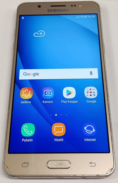 Samsung Galaxy J5 (2016), SM-J50FN, 16GB. Näytössä vähäistä käyttökulumaa, alhalla pienet lohkeamat kulmissa. Takakannessa vähäistä käyttäkulumaa ja tussin jälkeä, kameran päälilasissa pieni naarmu. Testattu ja toimiva