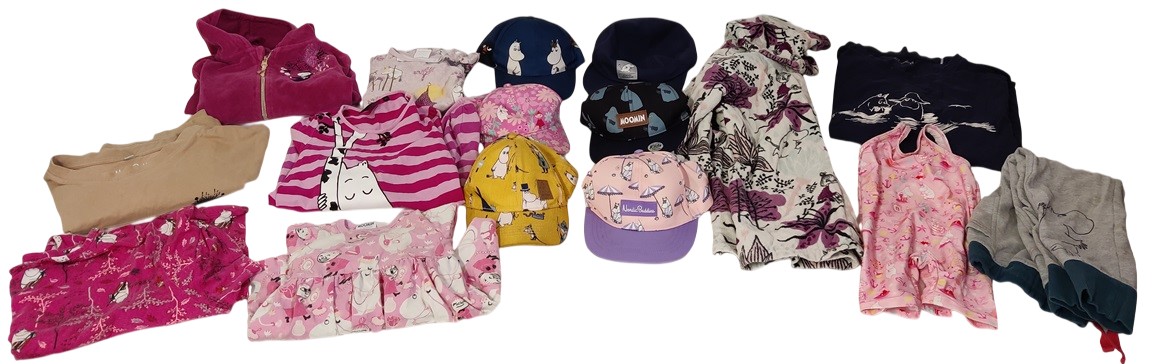 Muumikassillinen erilaisia vaatetta ja lippalakkeja