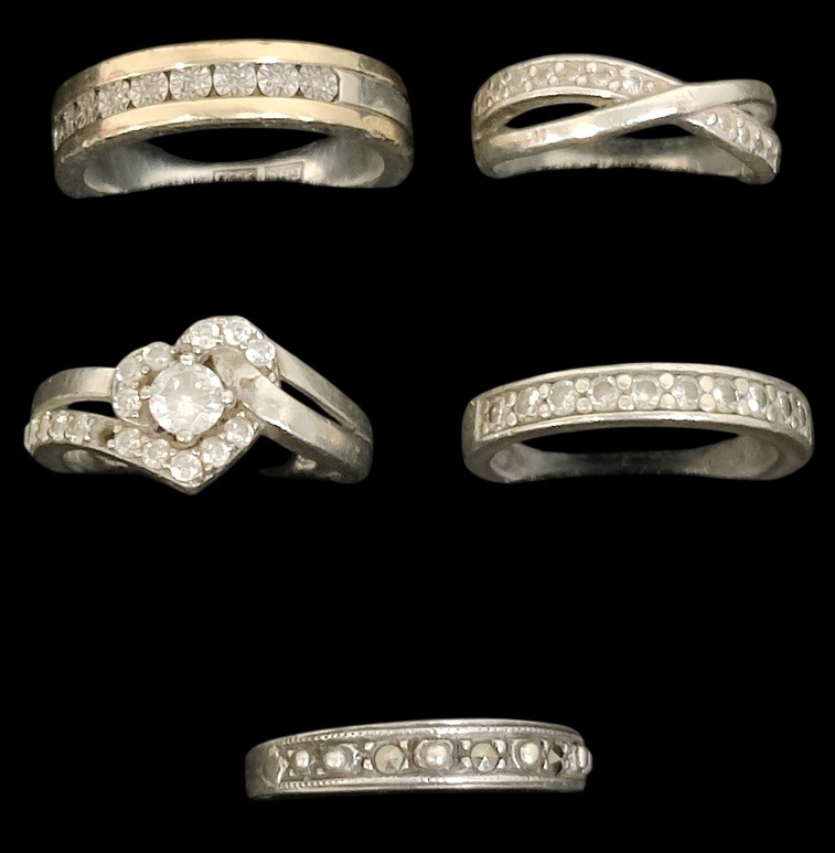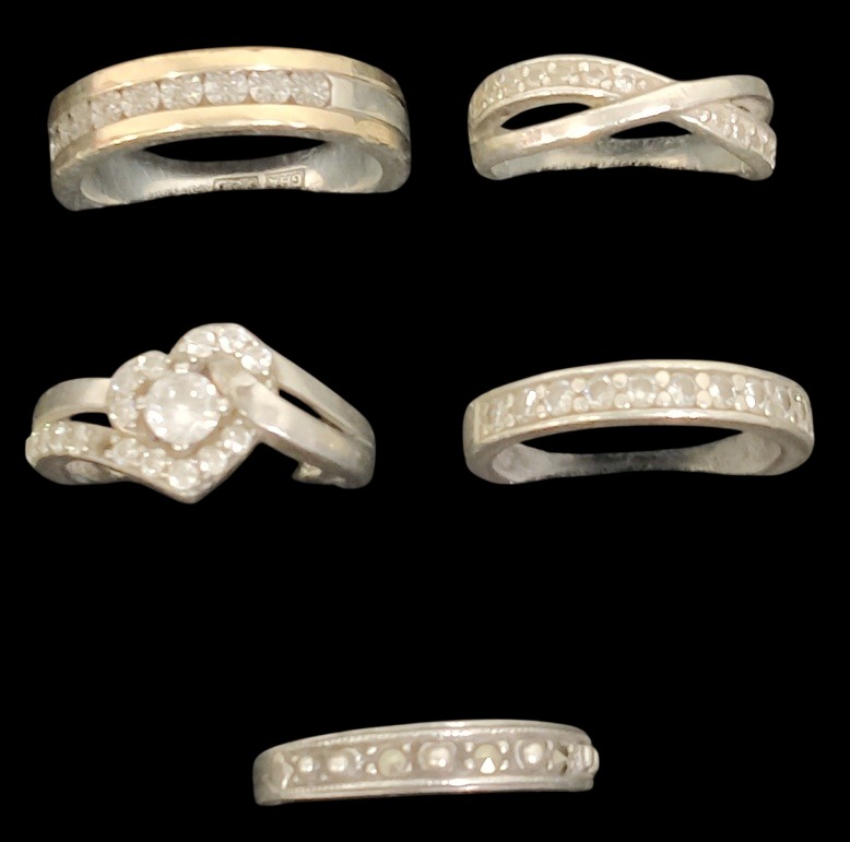 5 kpl kivellisiä hopeasormuksia, mukana myös Ti Sento Milano -merkin sormus, koot vaihtelee 15,75-18 välillä, kaivertamattomia