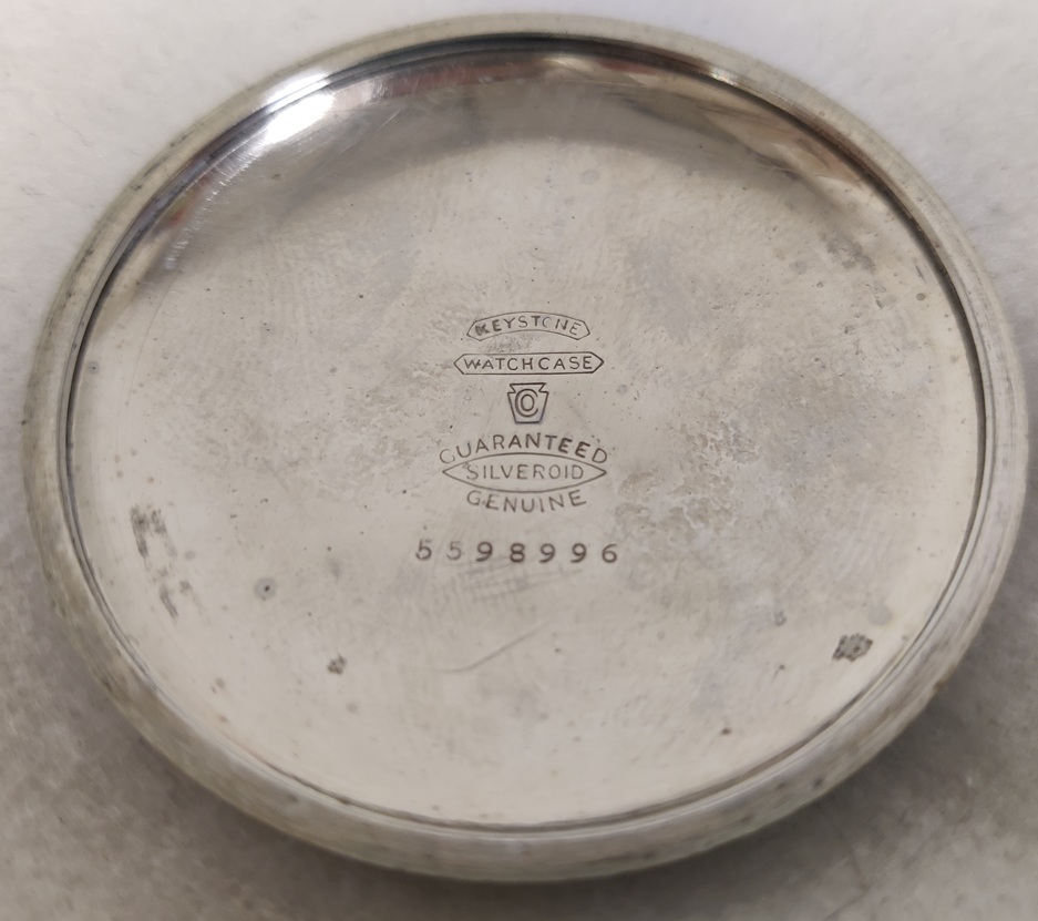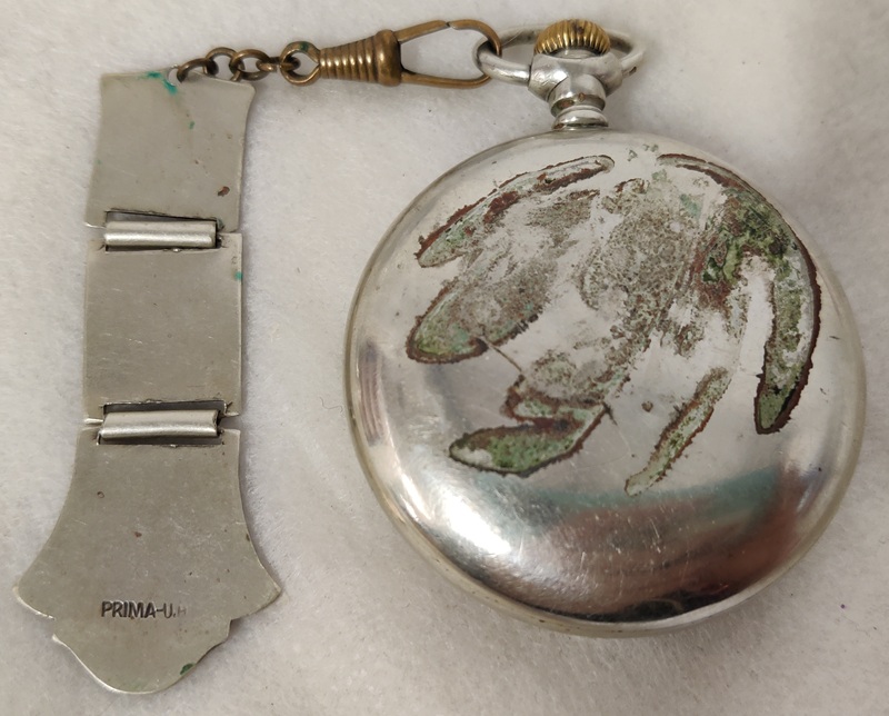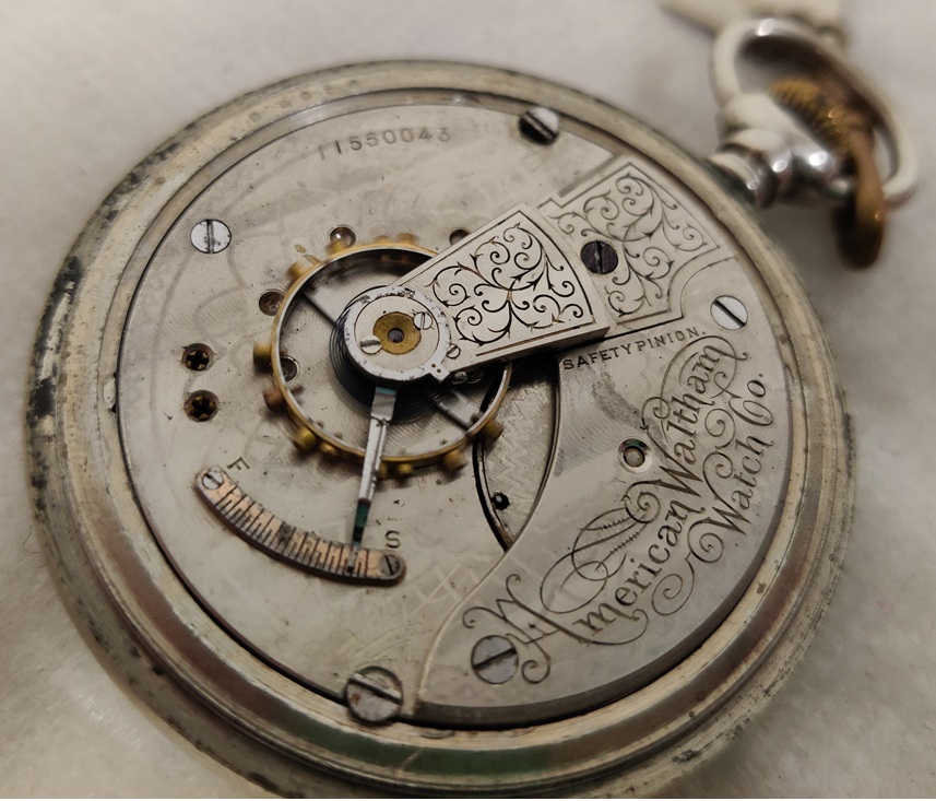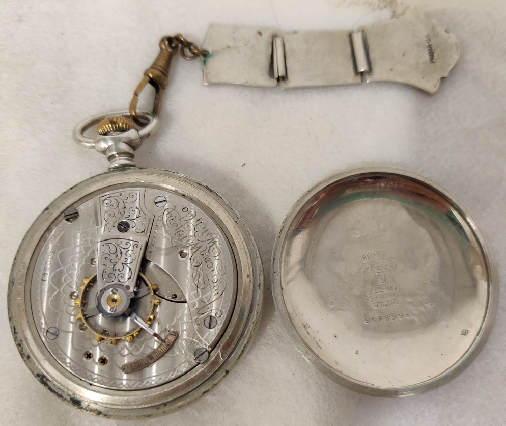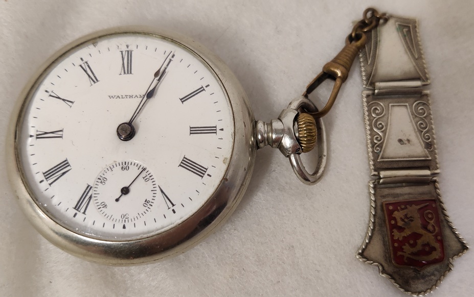 Taskukello, Waltham, sterling silveroid (hopeajäljitelmä), ulkomitat halkaisija n. 55 mm, uushopeinen, leijonavaakuna vitjakello, takakansi irtoaa hyvin kierteiltä, takakannessa likaa, puhdistettava / entisöitävä, vedettävä, toimiva