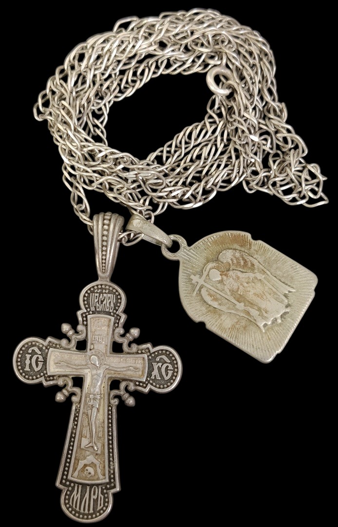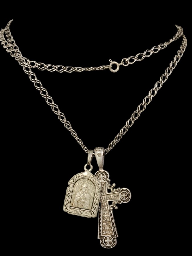 Hopeinen 925 pitkä 71 cm ketju, kaksi uskonnollista riipusta, risti ja ikoni, hopeaa 925, yhteispaino n. 20,90 gr