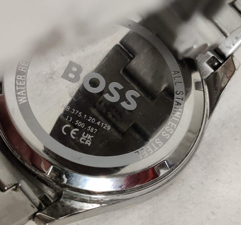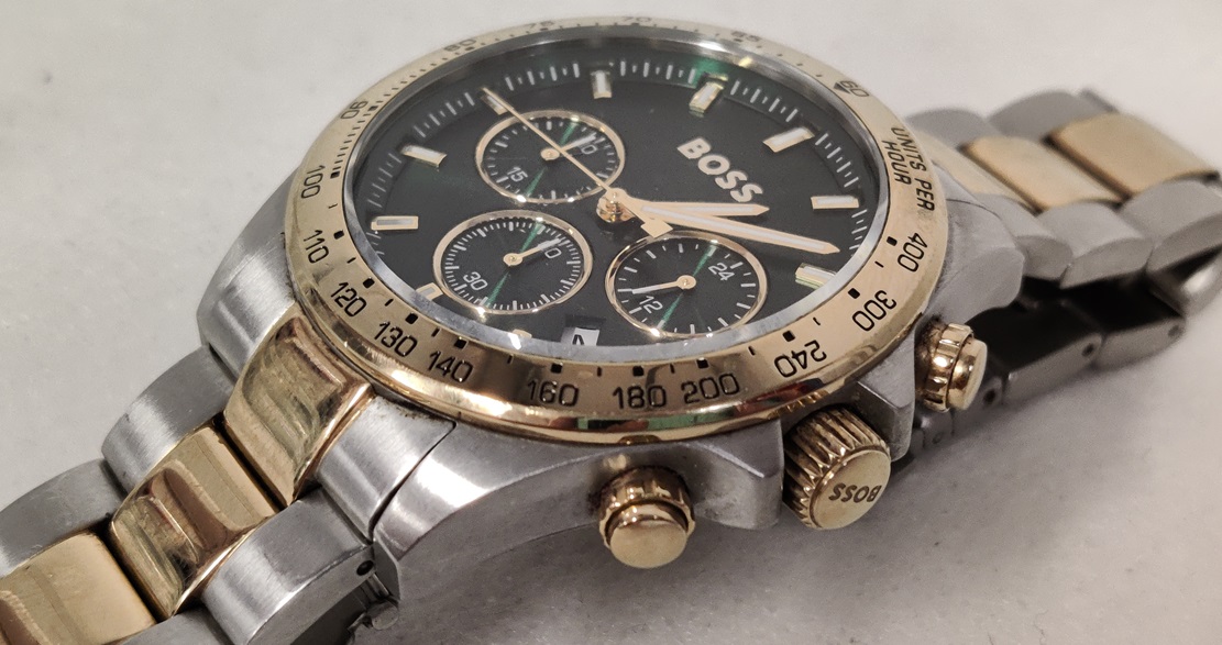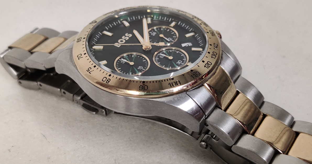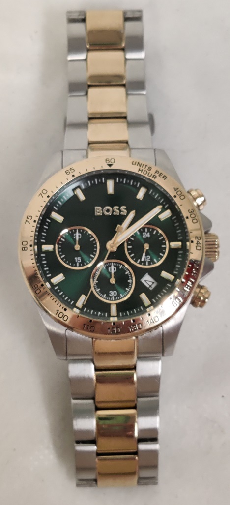 Hugo Boss Hero rannekello, kaksivärinen teräsranneke, kellotaulussa on pari pientä naarmua, jotka näkyy vain tietyssä kulmassa, kello käy kirjausvaiheessa, muutoin hyvin vähäistä käyttökulumaa, hb375.1.20.4129 13.500.587,