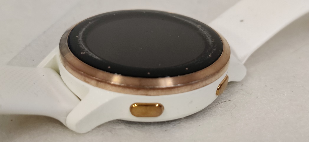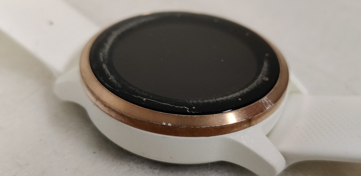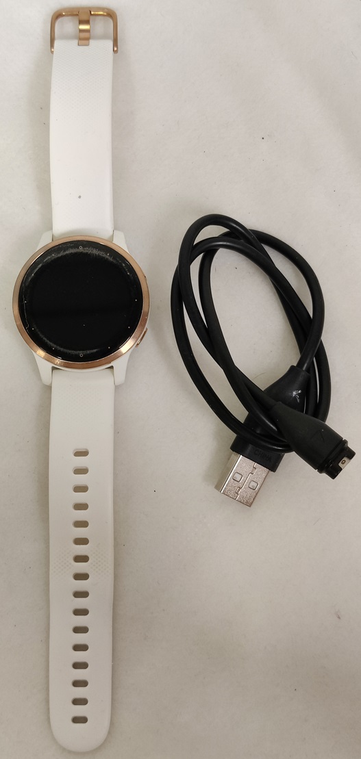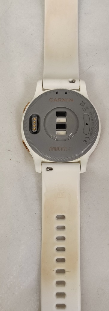 Garmin Vivoactive 4S. Näytössä, kellossa ja rannekkeessa on paljon naarmuja, käytönjälkiä ja kulumaa, remmilenkin pidikkeet puuttuu. Kellossa ei suomenkielisiä asetuksia, mutta kellon saa englanniksi. Testattu ja toimiva, akkutasoja ei testattu. Laturi mukana.