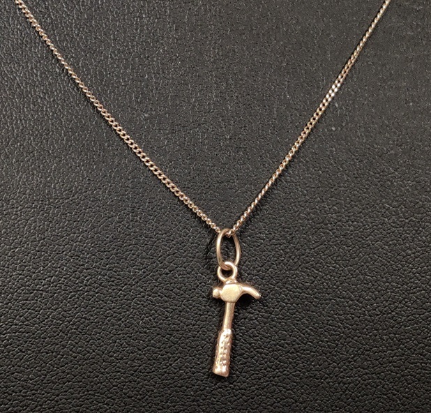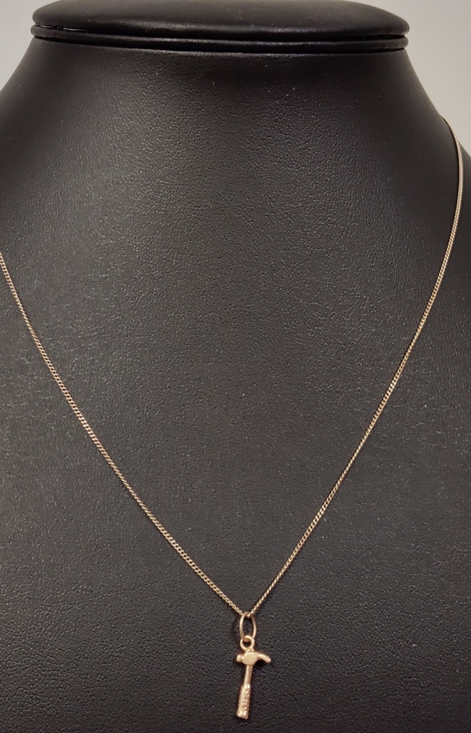 Kultainen ohut ketju, leima 585, kruunu, T.n, vuosileima P7, kultainen pieni vasara-riipus, leima 585, ketjun pituus n. 45 cm, kokonaispaino n. 2,65 gr, riipuksen pituus riipuslenkkeineen n. 21 mm