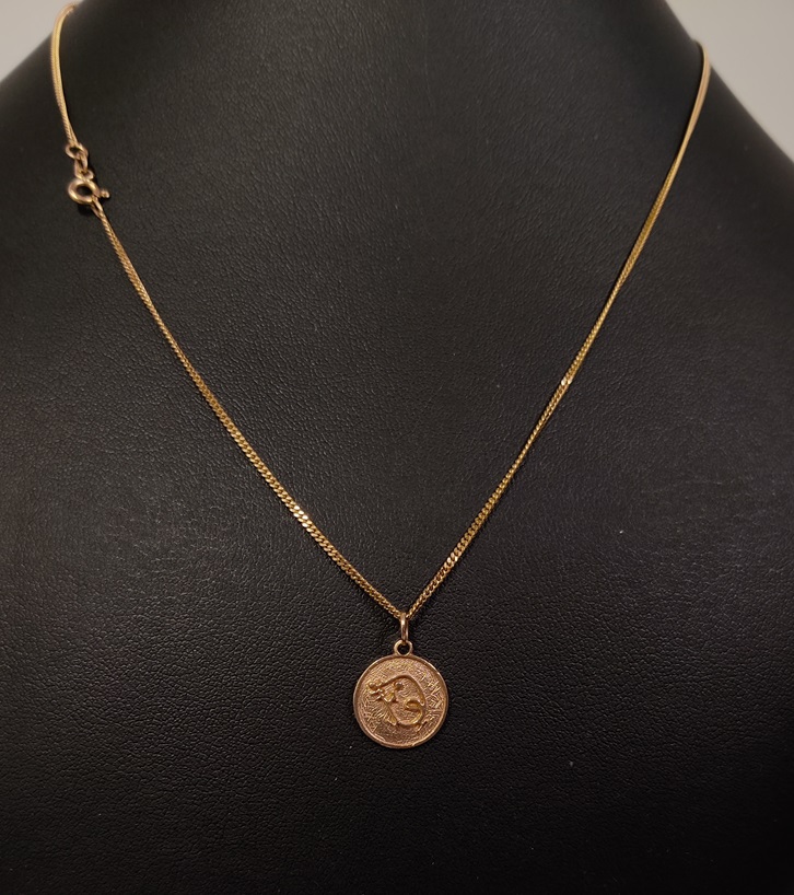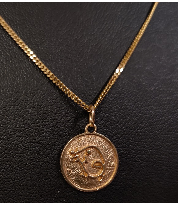 Kultainen ohut ketju, leimat 585, Ka ja kruunu, pyöreä riipus, nimikirjain kaiverrukset takana, jossa jokin piirroshahmo, leimat 585 kruunu ja vuosileima, riipuksen halkaisija noin 13,5 mm, kokonaispaino noin 4,8 gr
